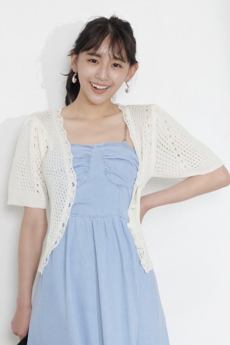 かぎ針の可愛いニットカーデはいろんなアイテムの上にサラッと使える優れものです。
