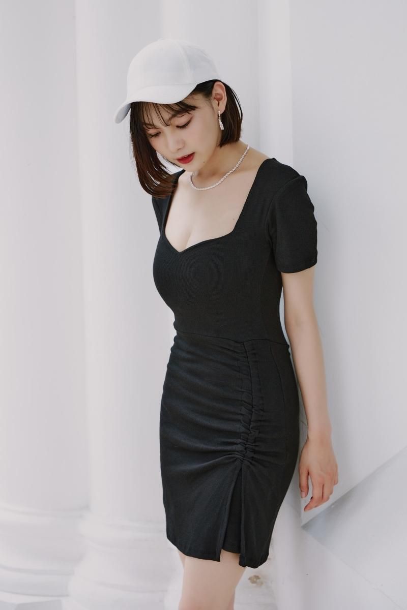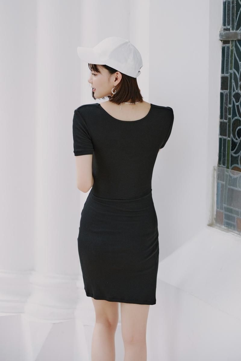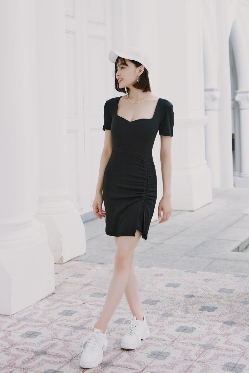 半袖で綺麗なデコルテラインが女らしく、さらにアクティブな膝上丈でスニーカー合わせが○!
